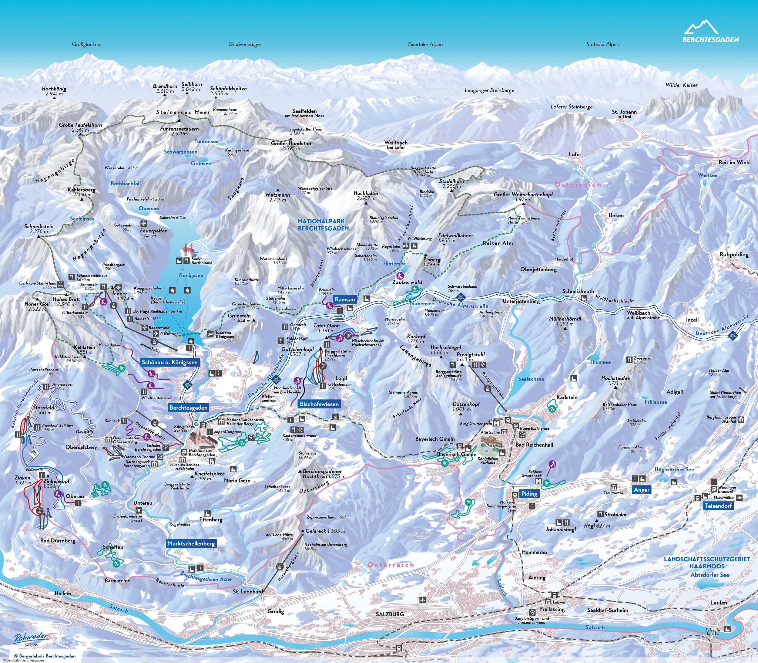 Voor het indrukwekkende panorama van het 2.713 m hoge Watzmann-massief en in het Nationaal Park Berchtesgaden ligt het romantische Berchtesgadener Land. Omringd door een 2.000 tot 2.700 meter hoge bergketen biedt deze regio in Opper-Beieren rust en idylle. Het Berchtesgadener Land heeft vijf niet met elkaar verbonden skigebieden, die zijn verenigd in de gelijknamige skipas. Met ongeveer 40 km aan pistes tussen 795 en 1554 meter hoogte en 22 liften is optimaal skiplezier gegarandeerd. Het Berchtesgadener Land is internationaal bekend om zijn wereldbekergeschikte afdalingen en als locatie voor wereldkampioenschappen rodelen, bobsleeën en snowboarden.Vanaf het seizoen 2024/2025 zijn er echter geen geprepareerde pistes meer beschikbaar op de Jenner. Toch blijft de rit met de gemoderniseerde Jennerbahn inbegrepen in de skipas. Bovendien kun je gebruikmaken van de nieuwe, ongeveer 1,4 kilometer lange rodelbaan vanaf het bergstation, de omgeving verkennen op de sneeuwschoenwandelroute naar de “Vorderen Pfaffenkegel” of de geprepareerde winterwandelroute rond de Speicherweiher uitproberen.